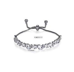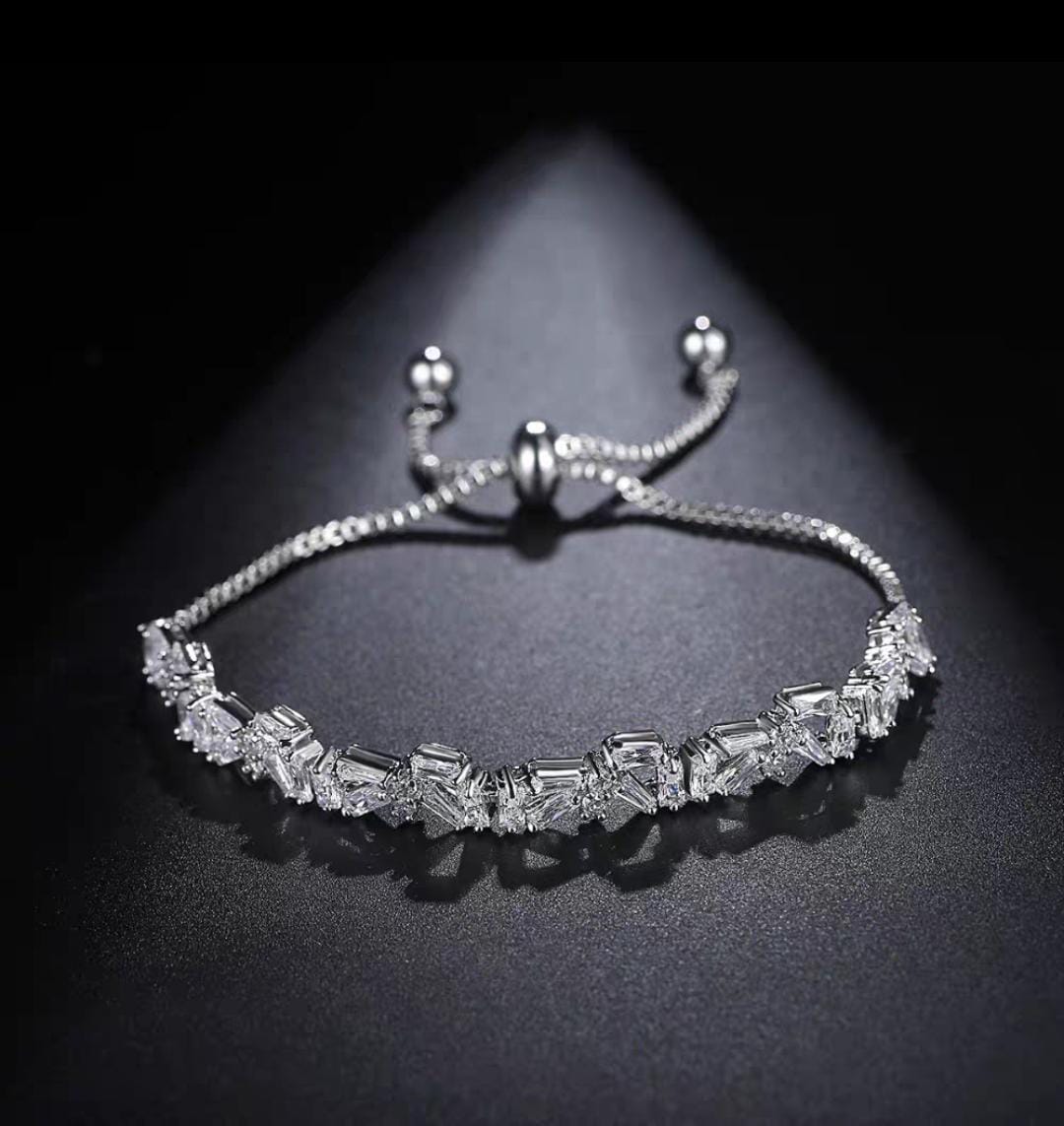 Shine with effortless elegance in this adjustable silver bracelet, lined with emerald-cut stones. Sleek, modern, and versatile—it's the perfect accessory to elevate any outfit with subtle spark.