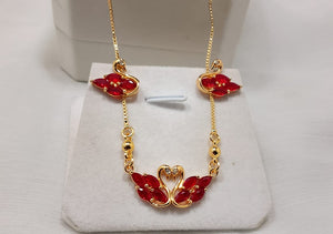 The necklace showcases two swans intertwined at its center, with two additional swan accents gracefully integrated into the golden chain. The accompanying earrings echo the swan design, creating a perfectly coordinated look. This set is ideal for adding a touch of grace and sparkle to any outfit, whether for a special occasion or everyday elegance.