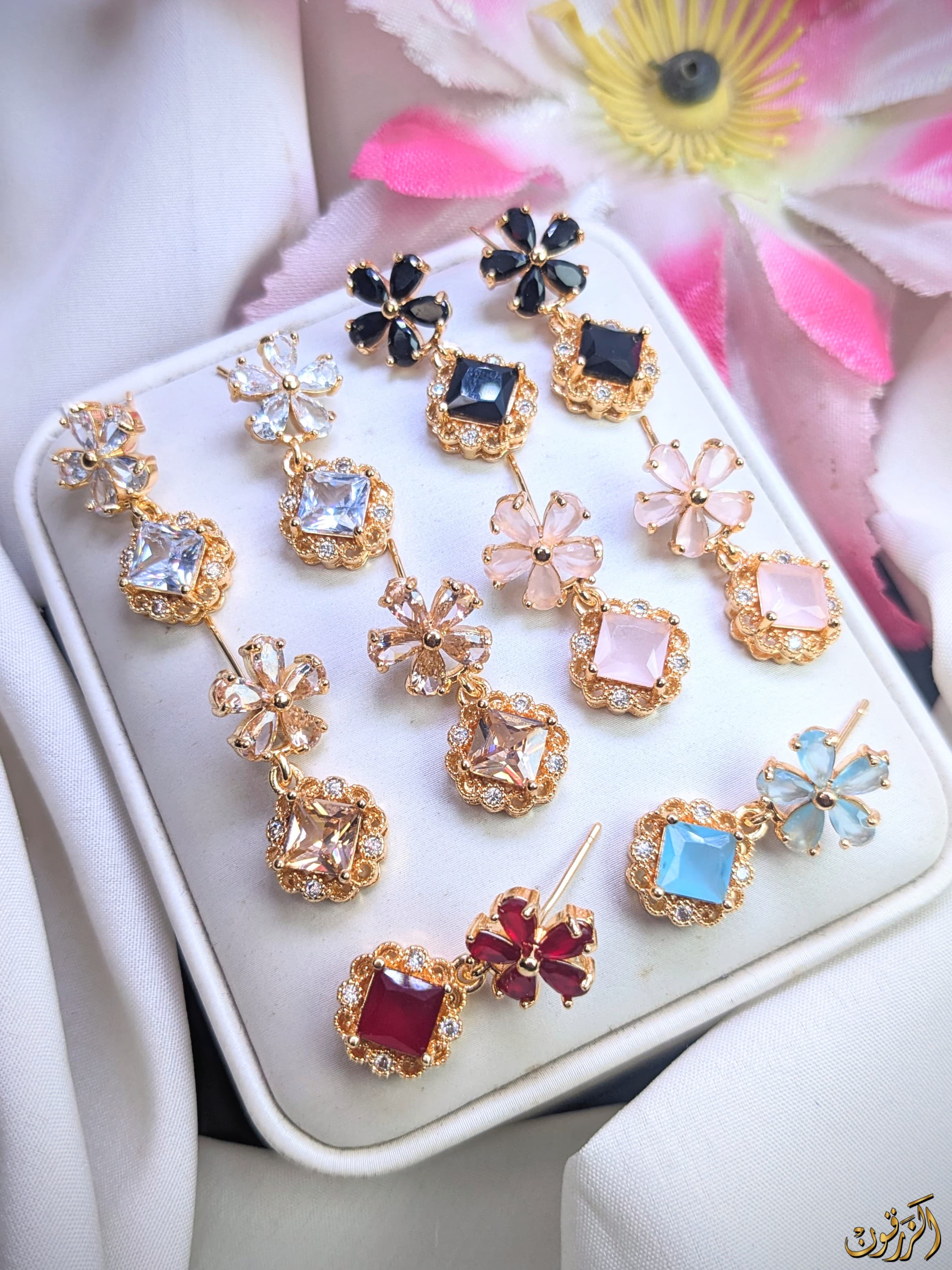Elevate your style with these stunning Zircon Flower Drop Earrings. Each pair features a delicate floral top crafted with sparkling zircon stones, leading to a radiant square-cut zircon gem framed by dazzling smaller stones. These premium, gold-plated earrings are an exceptional high-quality item, perfect for adding a touch of elegance to any outfit. Available in six beautiful colors: classic black, brilliant clear, charming peach, soft pink, serene light blue, and vibrant ruby red.